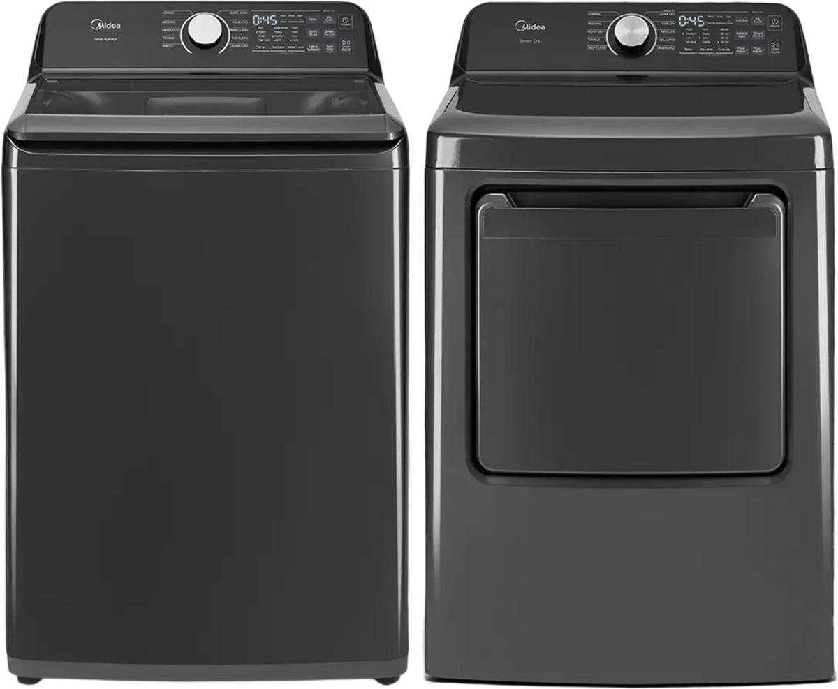 Midea® Metallic Gray Laundry Pair with 4.4 Cu. Ft. top load washer and 7 Cu. Ft. front load gas dryer.Read More