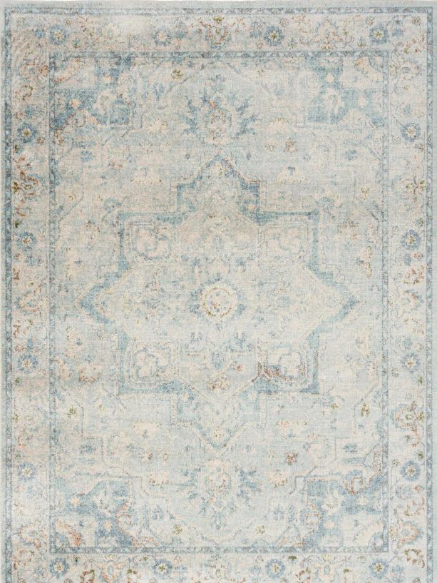 Vintage meets modern with this Persian rug from the Astra Machine Washable Collection. Featuring an artfully faded floral medallion pattern in light blue, the classic design is enhanced with a brilliant sheen that shifts in tone under different lighting.Read More