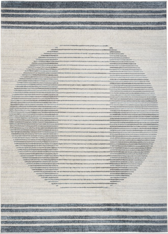 Invite a touch of Scandinavian charm to your home with this mid-century modern rug from the Astra Machine Washable Collection. The circular pattern is defined by striped edges in blue and silver grey, with a silky finish that shifts in tone under different lighting.Read More