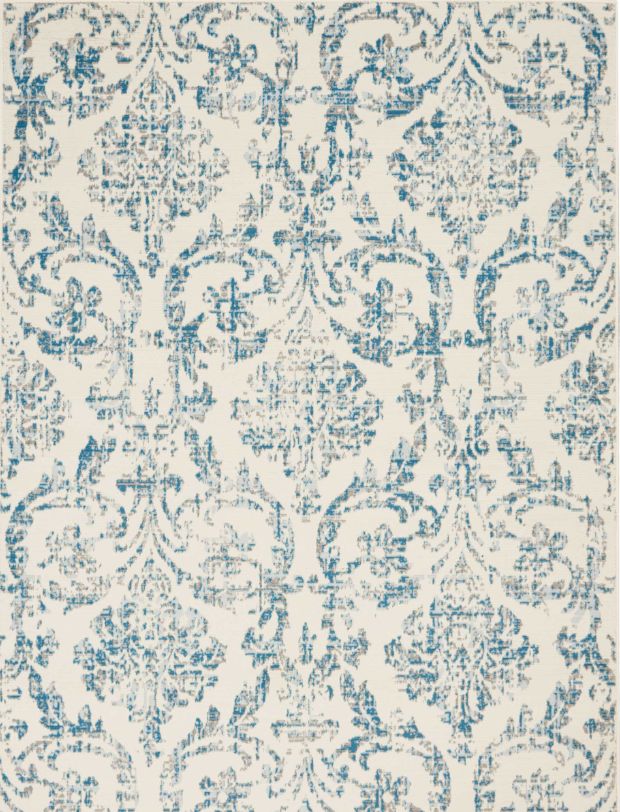 Dramatically distressed color effects and ornate European damask designs bring a vintage antique vibe to this Jubilant Collection area rug. Striated tones of blue and grey on an ivory white field bring an authentic elegance to your favorite room, with a sleek low pile of easy-care fibersRead More